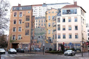 "At the boulevard's intersection with rues Denfert- Rochereau and Pelletier, this wall which was painted in trompe-l'oeil in 1987 (and renovated in 1997) recalls the traditional Croix-Rousse way of life." Full review