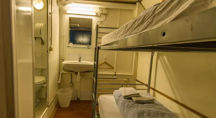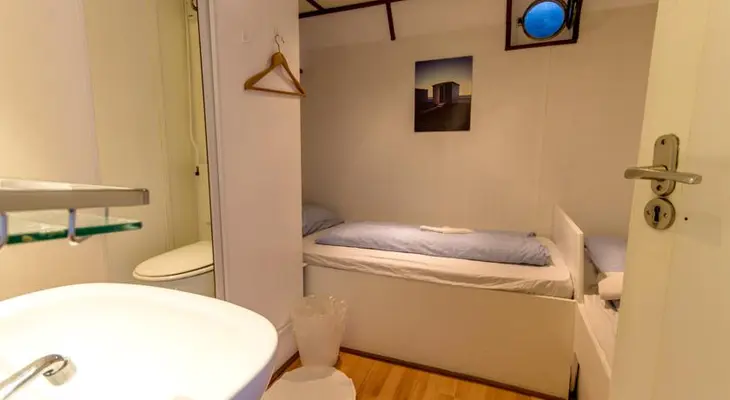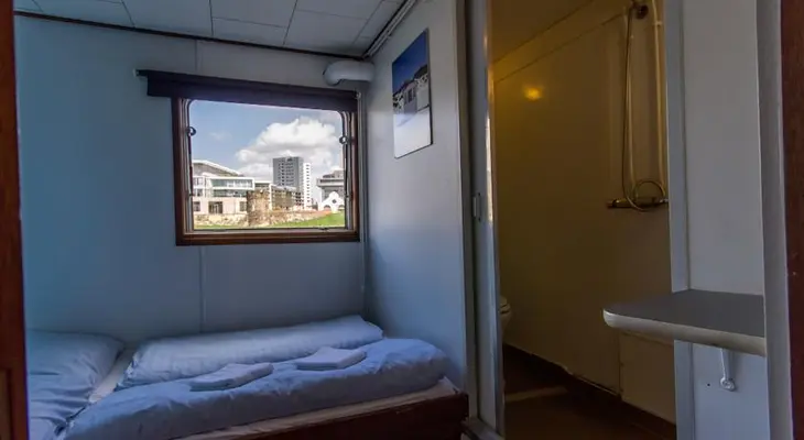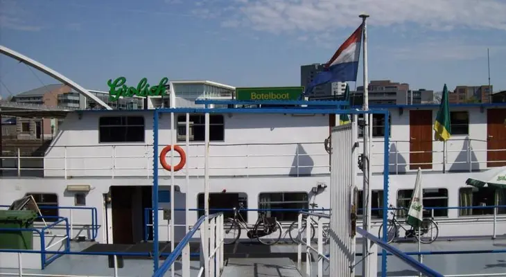 "Realise your dream of staying on a houseboat in one of the 34 compact cabins on this ship moored on the Maas' west bank." Full review