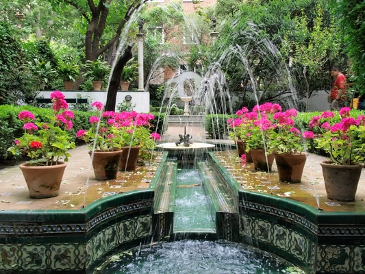 The garden, Moorish-inspired but with an Italianate pergola, is a delightful, peaceful oasis of calm, seemingly miles away from the roaring traffic outside.