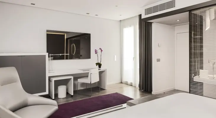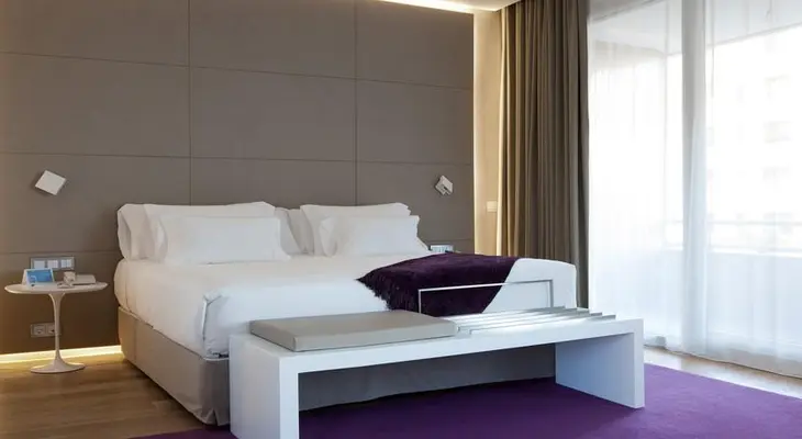 “A large, super-hi-tech four-star hotel with chic contemporary design in uptown Madrid, near the airport.”