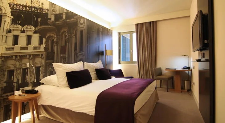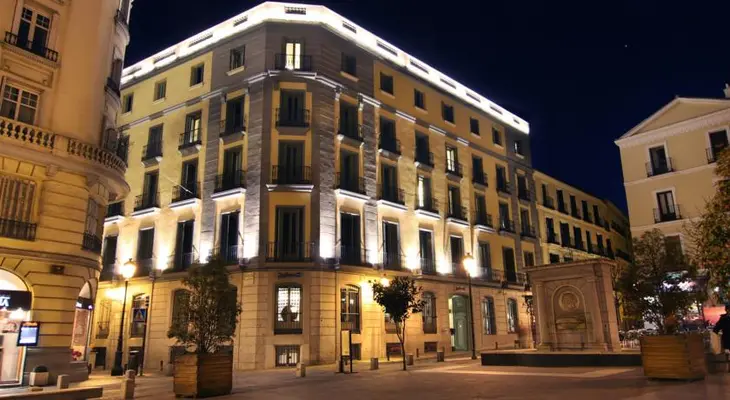 “Designer hotel located along the Paseo del Prado featuring sleek rooms in black, brown and white.”