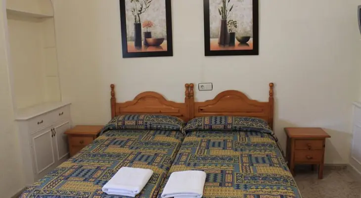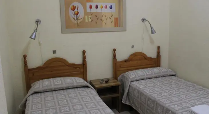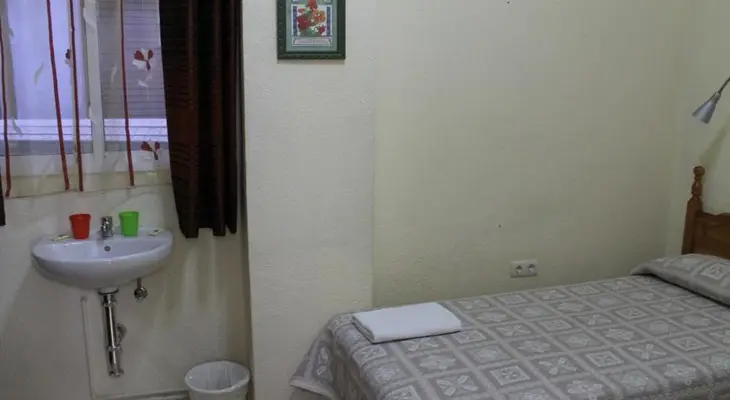 “Central and friendly pensión offering rooms with or without bath on the fourth floor (with a lift). Large family rooms also available. €49.”