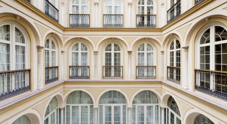 “The sumptuous historic exterior belies the modern interior and amenities in this sleek and business-oriented hotel.”