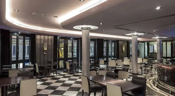 “Modern, upmarket and central hotel inside the shell of an original Art Deco edifice; satellite TV, room safes, wi-fi and a panoramic rooftop bar... Does frequent special offers. B&B.”