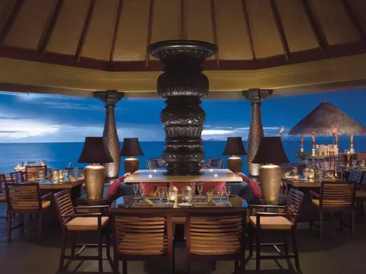 “Seductive private island resort accessible by speedboat with palm-thatched pavilions, villas, bungalows and suites overlooking the luminous waters of a lagoon.”