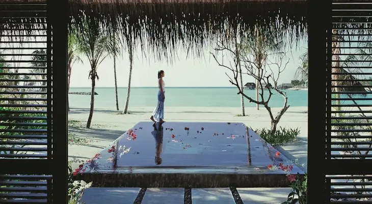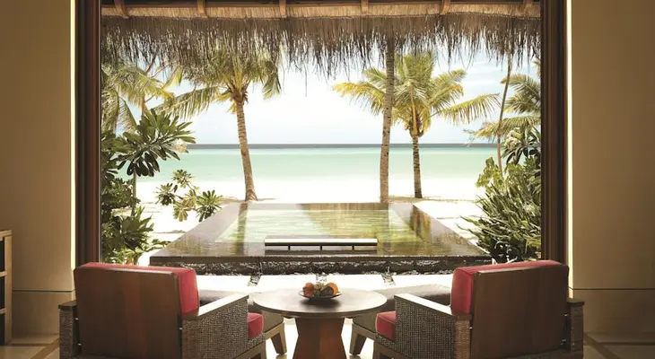 "130 villas—many of which have private lap pools or hover above the sapphire lagoon—have been crafted with tropical touches, such as coconut-shell sconces, sea grass thatch, and bamboo arches." Full review