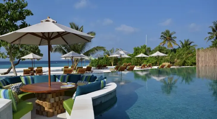 "An eco-friendly resort with 97 thatched-roof villas in the southern Maldives." Full review