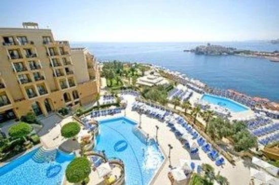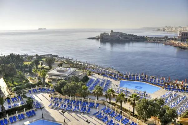"The 249-room Corinthia Hotel St.Georges Bay is a large, luxurious waterside resort, with seafront sunbathing (but no beach) and a full program of water sports." Full review
