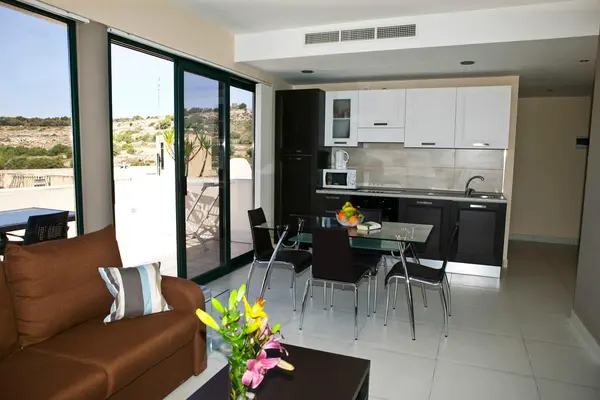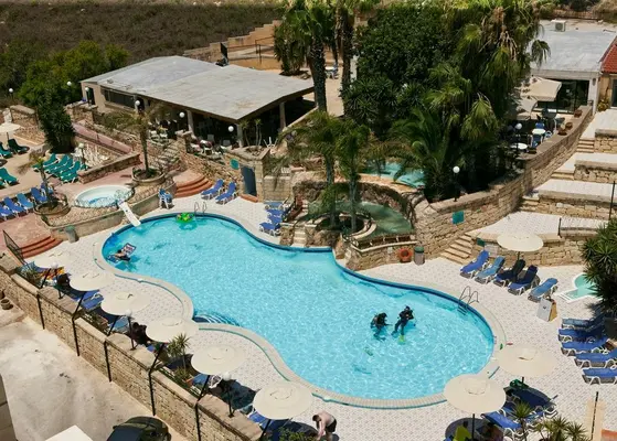 “The mid-range Porto Azzurro is an affordable, homey apartment hotel with 110 One- and Two-Bedroom or Studio units located in a quiet spot overlooking Xemxija Bay.”