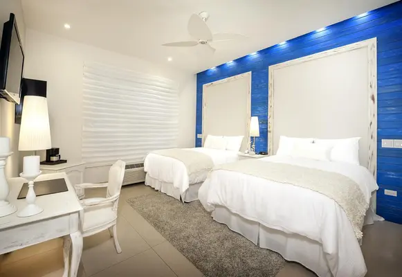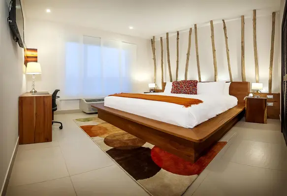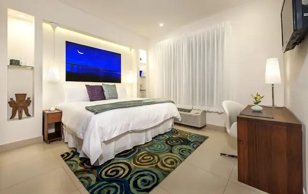 “The rooms are individually styled after different elements, with bold contemporary art and slate walls. Numerous restaurants are just around the corner.”
