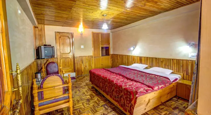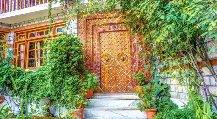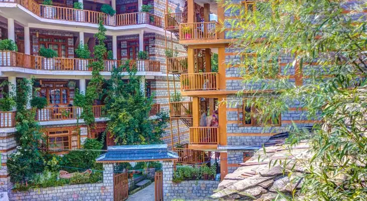 “Hidden at the end of the road in Old Manali, this four-storey stone and timber hotel overlooks the slate roofs of village homes with excellent views across to the mountains.”