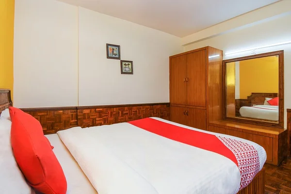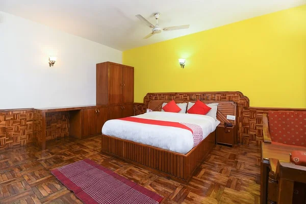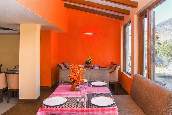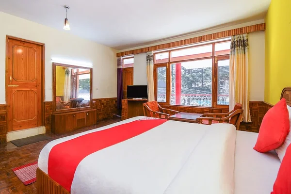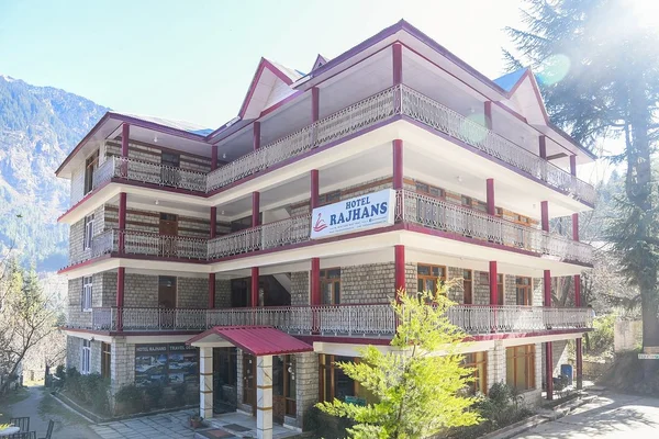 “Stylish new four-storey brick building with valley views from the more luxurious higher rooms; all attached with TV. ₹700.”