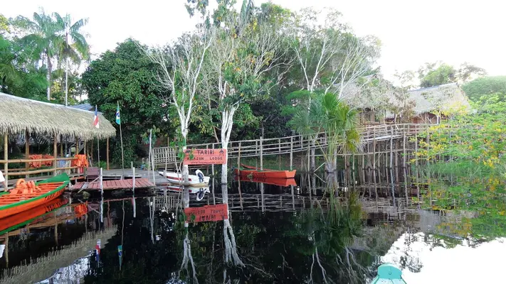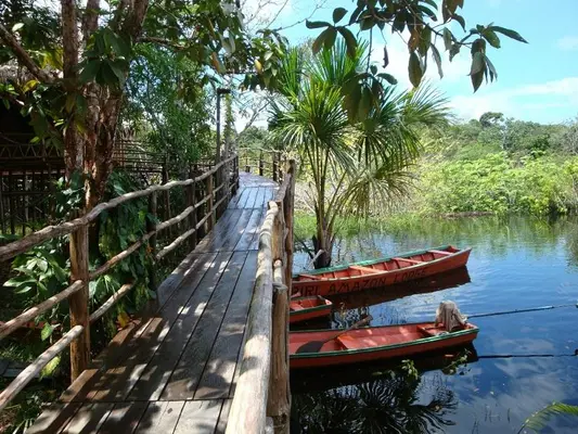 “On the shores of Lake Acajatuba, this family-owned resort consists of charming wooden rooms built on stilts above the jungle floor.”