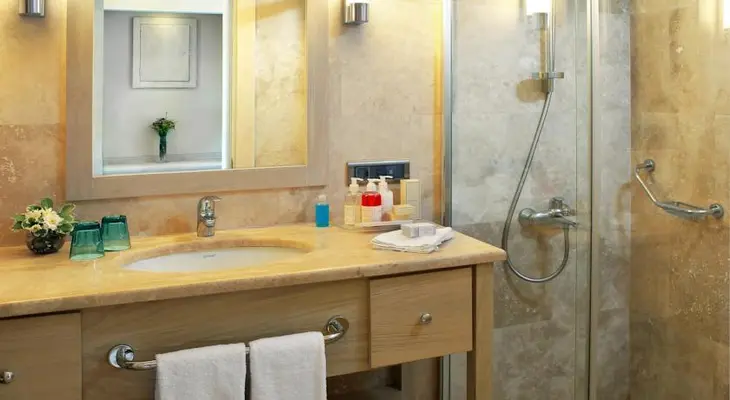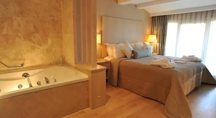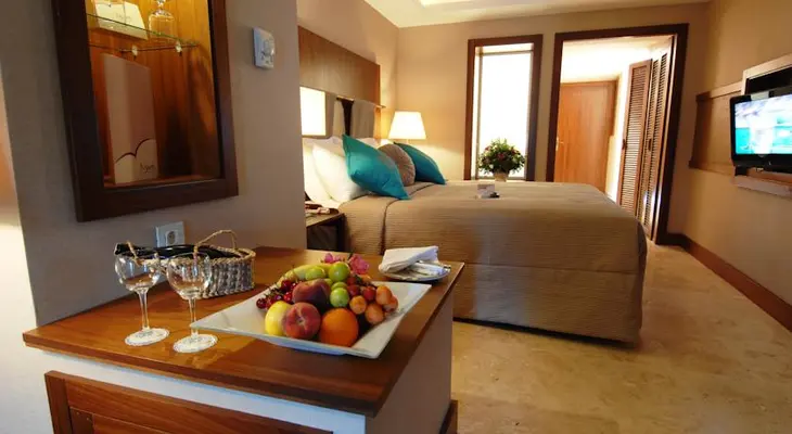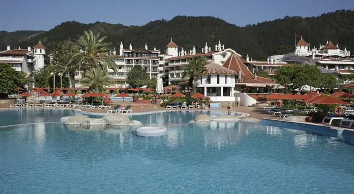 “Built on the site of a 7th-century monastery (some of the ruins are visible out front), the all-inclusive Marti fronts an expansive playground of sand, lawns, and a duplex pool.”