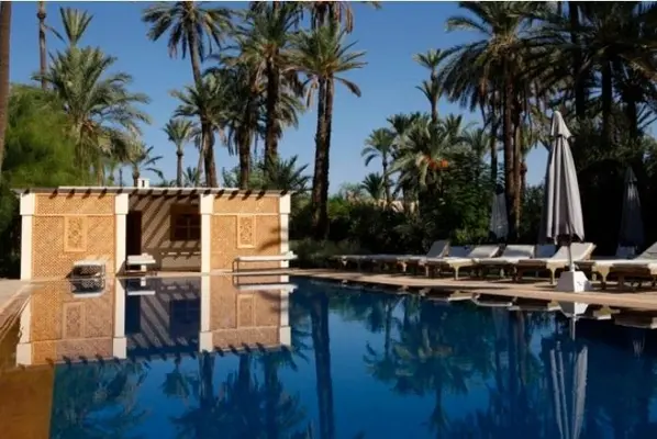 "Set in 22 hectares of lavish gardens in La Palmeraie. Its 24 rooms are arranged in five houses, many with their own patios...five swimming pools and a tennis court are tucked in there too."