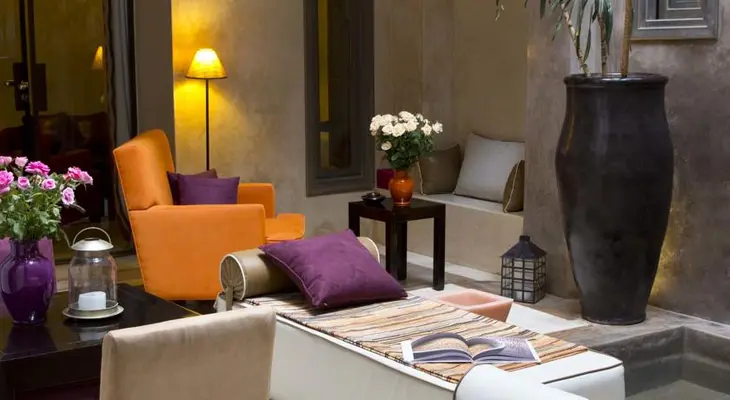 "Take a Moroccan riad, renovate it in a contemporary minimalist style with Starck-ian bathroom fixtures, cubic leather furniture and boldly striped textiles . . . and you’ve got riad Dar One."