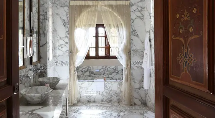 “Each riad has multiple patios, silk-paneled salons and bedrooms, and (for the ultimate in discreet service) a staff that enters and leaves via a network of underground passageways.”