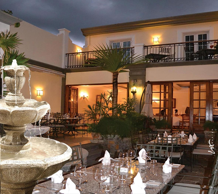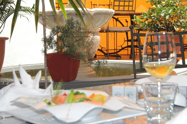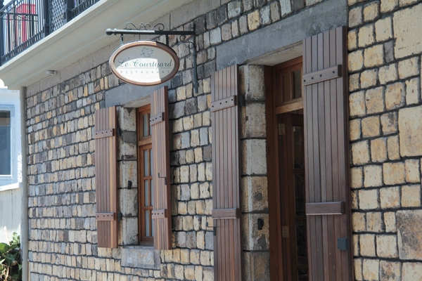 “Set around an attractive courtyard, this European-style restaurant also features a stylish indoor dining space in a restored stone structure.”