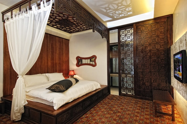 "The lobby sets the tone, with old wooden furniture, a water feature and uniformed staff."