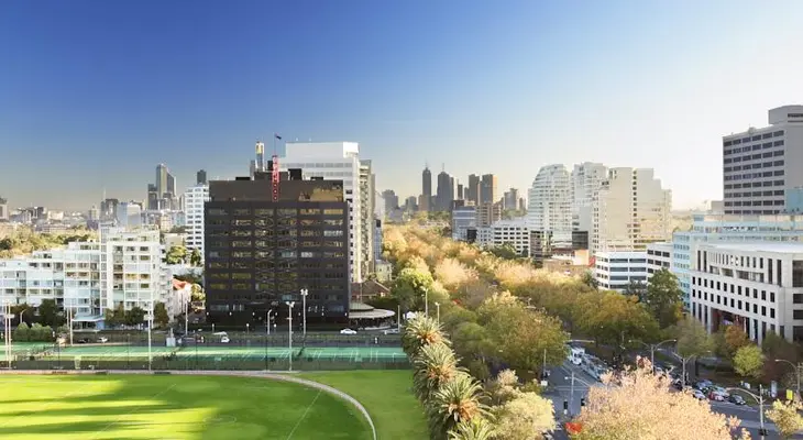 "St Kilda Road is a grand boulevard linking the city with the beach. Some rooms at this hotel have city or park views."
