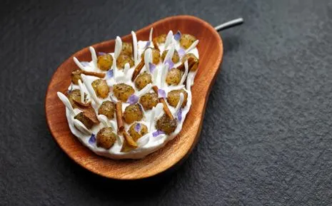 "New Zealand–born chef Ben Shewry’s “simple dish of potato cooked in the earth it was grown in” is surrounded by coconut-husk ash and saltbush leaves." Full review