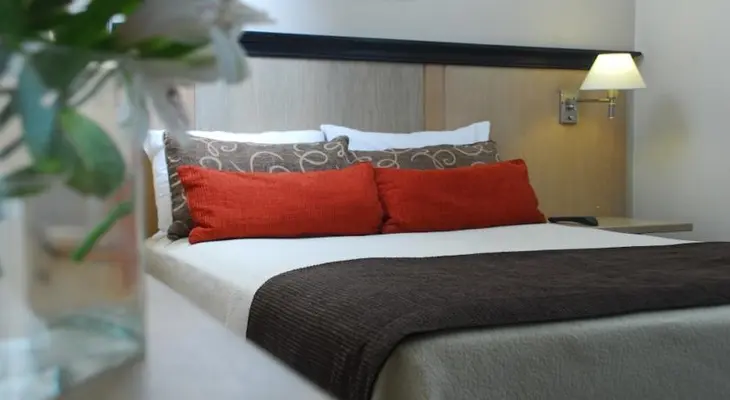 “Right on the central plaza, this business-class hotel has some fine features, including large rooms and a decent-sized swimming pool.”