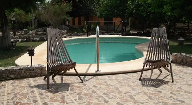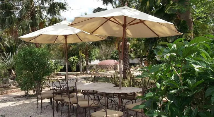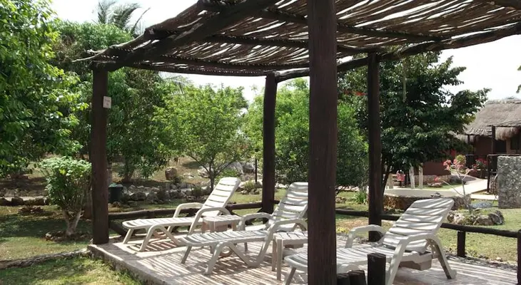 “Spacious palapa-roofed cabañas fit unobtrusively into the well-tended gardens and surrounding natural landscape. Their rustic Maya design uses clay and wood to keep them cool.”