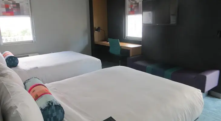 “The hip, minimalist accommodations are equipped with 42-inch LED TVs and balconies or patios, and other features include loft-style common spaces, a 24/7 grab 'n' go market, an outdoor pool.”