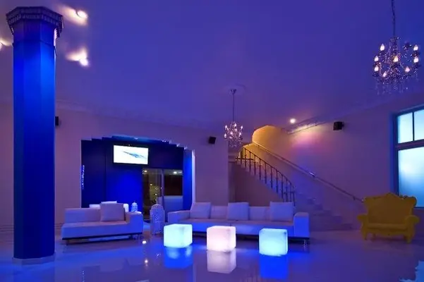 "Designed by French architect Eric Raffi, it's a swellegant combination of cool and warmth, with rich dark-wood accents and rainbow-blue hues." Full review