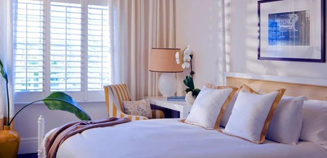 "The fresh interior is more Savannah than SoBe, with chairs upholstered in striped fabric, curtains and bedspreads bordered in matching colors—lavender, mustard, green—and a neat pile of books." Full review