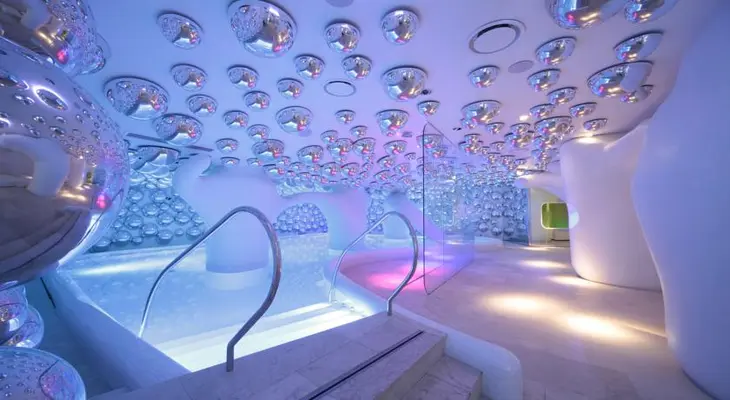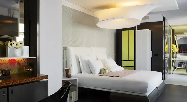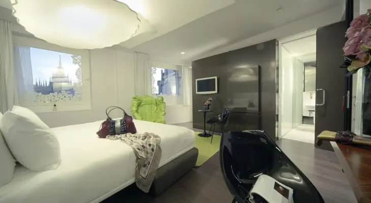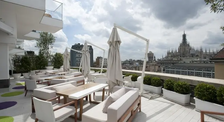 “Former bank turned futuristic design hotel with a champagne bar and hip spa in Milan's fashion district.”