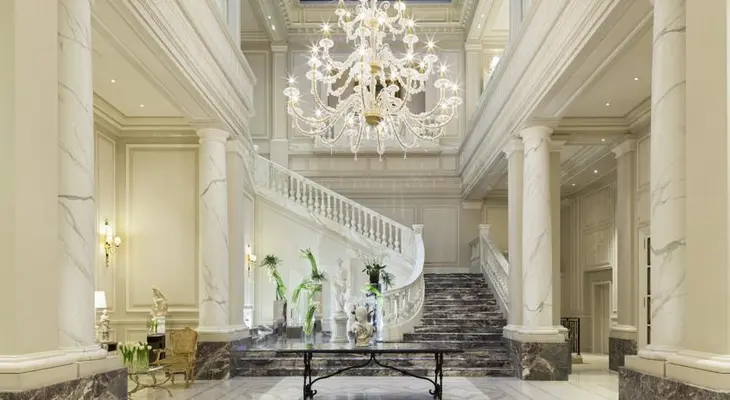 "The entry, with its marble columns and grand staircase, is as imposing as they come. Upstairs, the rooms and suites come in two: a contemporary Milanese luxury look and a more ornate Parisian style" Full review