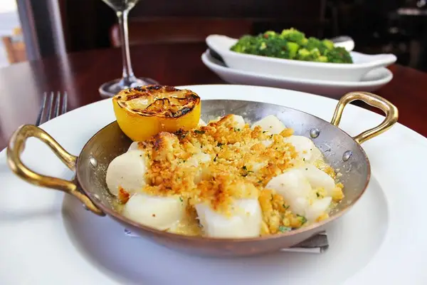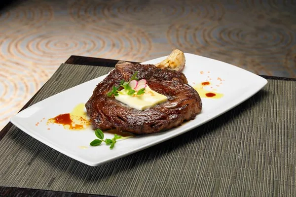 The vibe is classic steakhouse with dark woodwork, leather furniture, hardwood floors, a fireplace, comfortable booths and a long dining counter. — Gayot