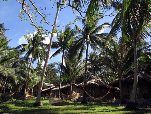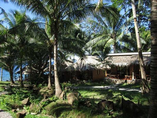 "A line of well-constructed thatch-roofed cottages face one another across a palm-tree-filled garden (with several hammocks) that ends on a rocky shore battered by waves." Full review