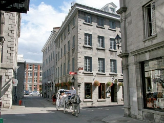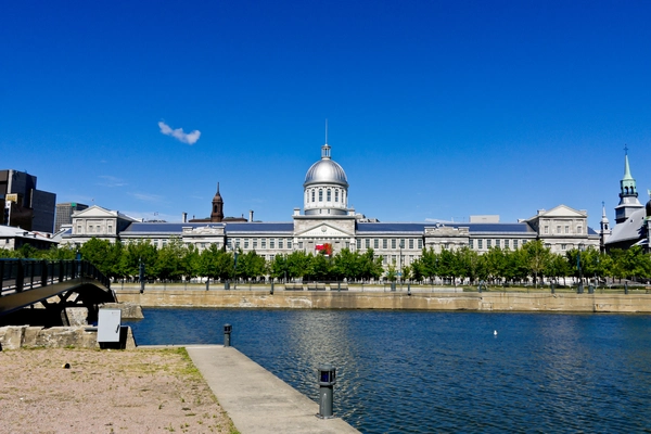 The city skyline rises up from the stone buildings along Rue de la Commune. Most prominent of these is the domed Bonsecours Market. — Travel + Leisure
