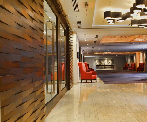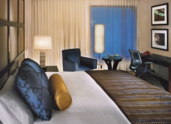 "Riding the several stories up to the lobby level in a glass elevator provides a quick, surprising 180-degree view of the metropolis below and sets the tone for this hotel."