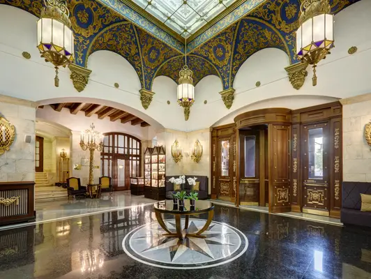 It's a huge hotel (363 rooms), with a grand lobby, an even grander restaurant under a vaulted stained-glass ceiling, and fountains and marble pillars for adornment. — Concierge
