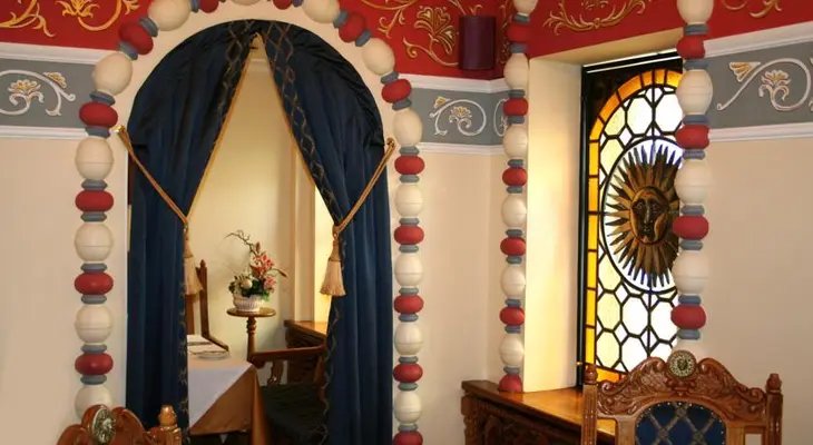 "Russian folklore and fairytales enchant in cute warm atmosphere on old historic block. Stained glass windows and stucco moldings."
