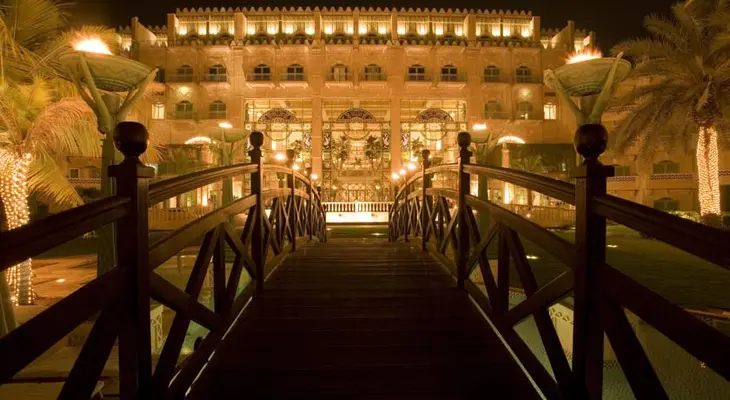 Its exteriors of ivory, sand, and salmon merge with the surroundings. Doormen in sultan-like white outfits and mustard-colored turbans welcome guests. — Condé Nast Traveler