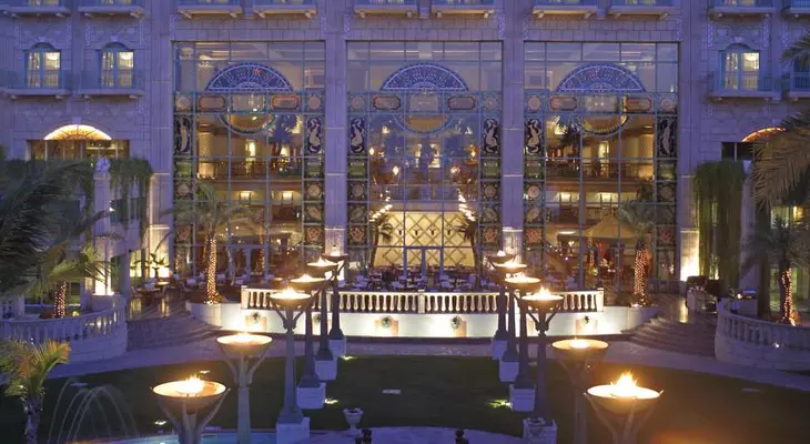 “With soaring ceilings, gilded columns, and giant stained-glass windows, this Arabian-style luxury hotel sets a particularly opulent tone in the grand lobby.”