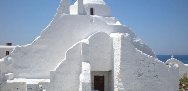 "Mykonos' most famous church is the Panagia Paraportiani. It is actually five small churches amalgamated, in classical Byzantine style, into one asymmetrical entity." Full review