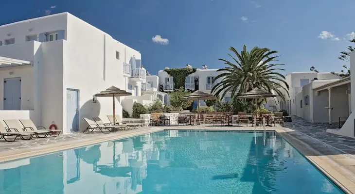 “The Aeolos Mykonos is a 28-room hotel perched hillside just over a half-mile from Mykonos Town center.”