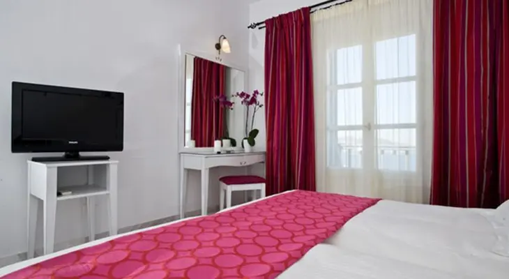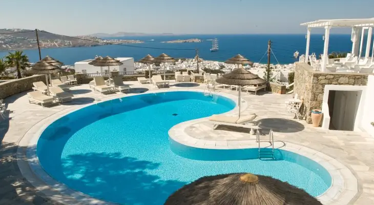“Atop a hill with vistas of the town, the port, the windmills, and the sea, Hermes Hotel has clean and comfortable rooms, a breakfast area, and a pool with breathtaking views.”