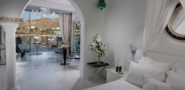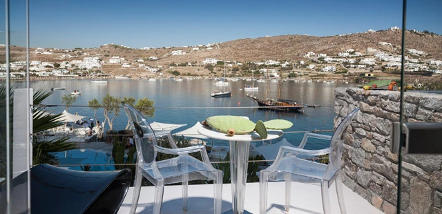“Mykonos villa-style boutique hotel overlooking Ornos Bay with a glam swim-up pool bar and private yacht.”