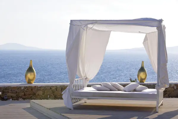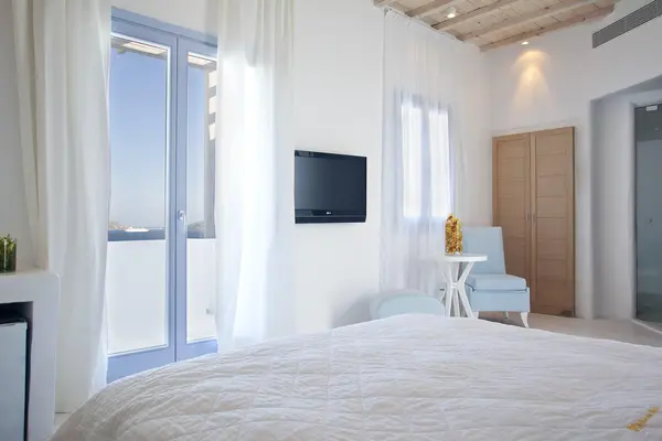 “All-white boutique close to Agios Stefanos beach with an open-air spa and a restaurant overlooking Mykonos town.”