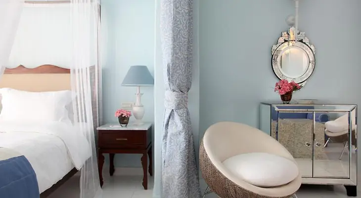 “Nissaki Hotel is a posh, boutique hotel overlooking the exclusive Psarou Beach and less than a five-minute walk to the beach of Platis Gialos.”
