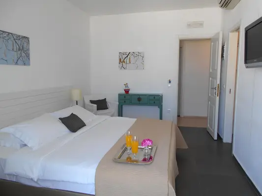 “PortoBello Boutique Hotel is a three-pearl property located on a hill in Mykonos Town -- about a 10-minute walk to the old port and Little Venice.”