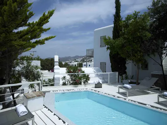 "This small luxury hotel complex sits high on a hilltop overlooking Mykonos town, and its swimming pool terrace, splendid enough in itself, boasts commanding views of the city’s rooftops" Full review
