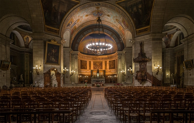 Inside, heavy hexagonal pillars support the cupola and are decorated with stained-glass windows and frescos. — Michelin Guide