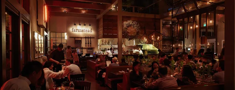 Farm has all the architectural elements of an American farmhouse, including a central hearth, hardwood floors, and an A-frame roof, with the styling of a contemporary restaurant. — Travel + Leisure